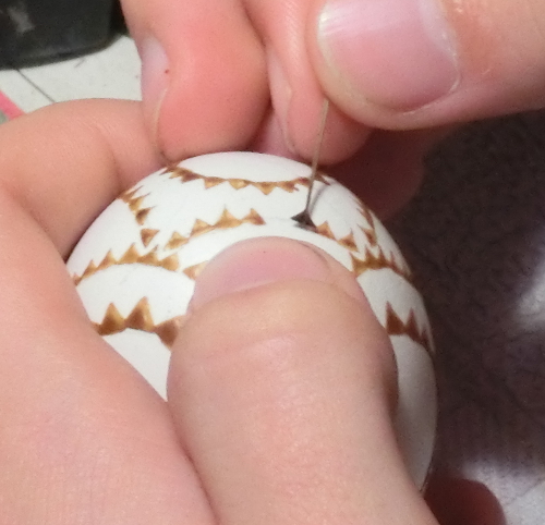 Jetzt kann das rohe Ei ausgeblasen werden. An der Bauchseite stechen Sie ein Loch von ca. 4-6 mm Durchmesser. In die Spitze stechen Sie nur einmal ein. Dann blasen Sie das Ei aus. Halten Sie Zellstofftücher bereit, mit denen Sie gegebenenfalls verlaufendes Eiweiß vorsichtig vom Ei wegtupfen.